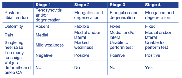 A disfunção do tibial posterior pode ser classificada em quatro estadios de acordo com a gravidade: