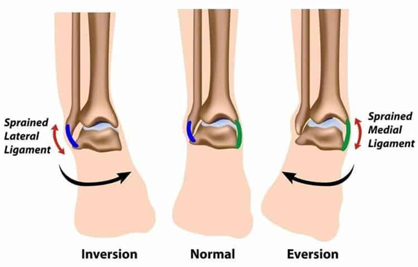 A lesão lateral ocorre por inversão do pé quando este se encontra em flexão plantar (ex.: pisar em buraco). As mediais ocorrem em eversão forçada, e geralmente associada a um trauma de maior energia. As entorses altas ocorrem com o pé em rotação externa e em dorsiflexão.