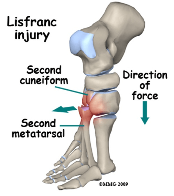 A lesão pode ser isolada ou então associada a fratura-luxação (quando existe a fratura dos ossos metatarsianos e/ou do tarso assim como a luxação das articulações).