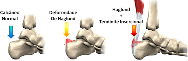 Os microtraumas de repetição levam à inflamação do tendão, que quando prolongada leva a degeneração do mesmo e a deposição de cálcio criando entesófitos (esporão). Em alguns casos, há uma deformidade da tuberosidade posterior do calcâneo e uma bursite retrocalcaneana, gerando o Síndrome de Haglund.