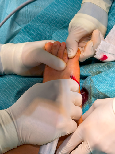 Os procedimentos cirúrgicos podem ser realizados por técnicas abertas ou técnica percutânea, por exemplo, através de pequenos orifícios, por onde são introduzidos os instrumentos para corrigir a deformidade.
